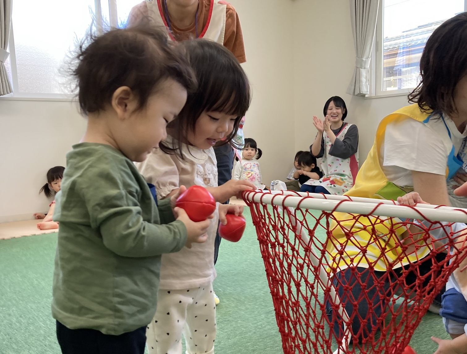 今週末は「みに運動会」を、連携施設はるまちこども園の広い遊戯室で実施します。